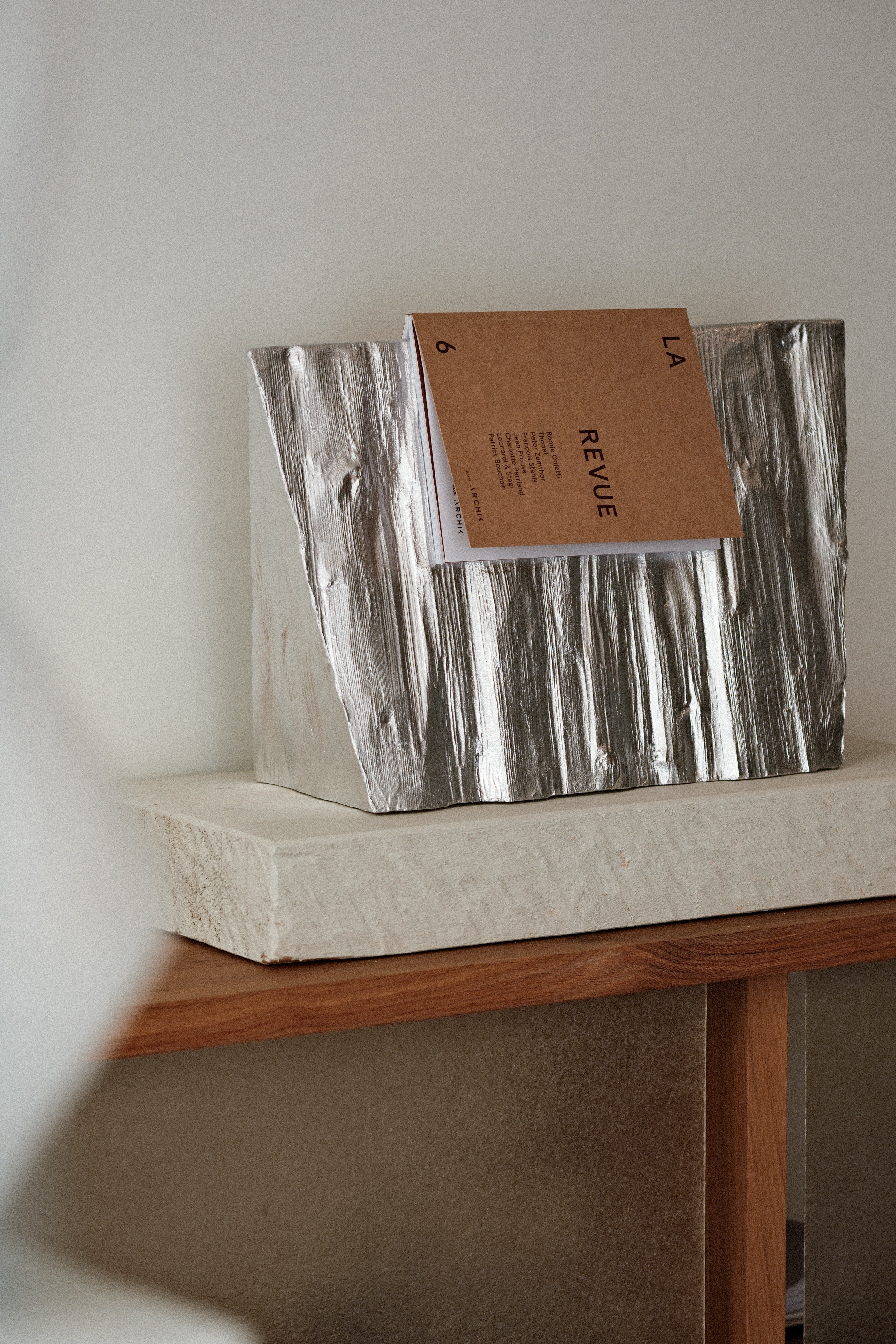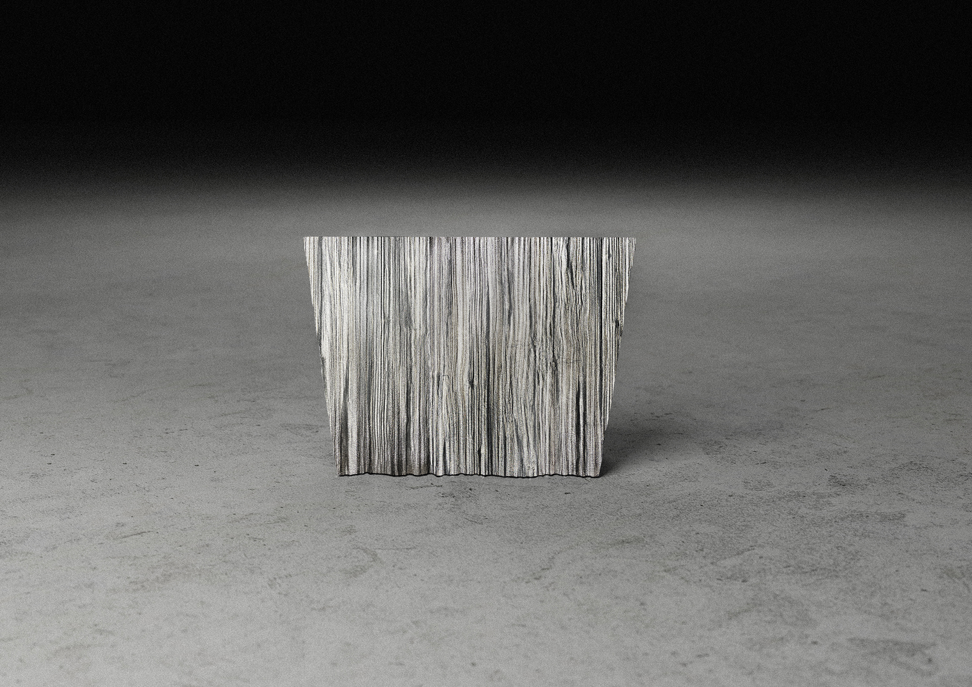 This monolithic object, which enriches the Cambium collection, is not defined. It is a sculpture when not in use and becomes an object/small piece of furniture when a book is placed on it.